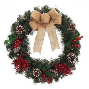 - Burlap bow, snowy pinecones and red holly berry accents