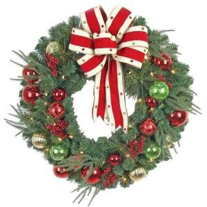 Home Accents Holiday 32 in. LED Pre-Lit Jolly Artificial Christmas Wreath with Ribbons, Baubles and 50 Battery-Operated Warm-White Lights-CHZH1761698THY – Description
