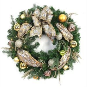 Home Accents Holiday 32 in. LED Pre-Lit Manhattan Artificial Christmas Wreath with Ribbons, Baubles, 50 Battery-Operated Warm-White Lights-BOWOTHD1606THY – Description