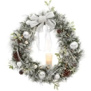 Home Accents Holiday 36 in. Battery Operated Snowy Silver Pine Artificial Wreath with 40 Clear LED Lights and LED Candle-2258080HD – Description