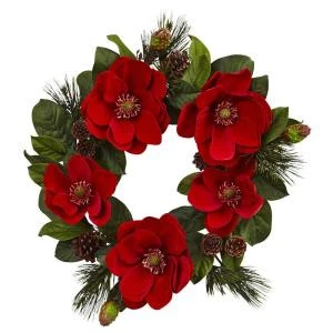 Nearly Natural 24 in. Red Magnolia and Pine Artificial Wreath-4869 – Description